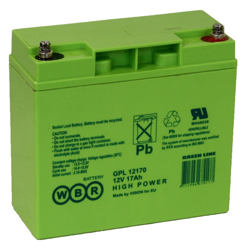 WBR серии GPL 12170 - герметизированные, выполненные по технологии AGM, свинцово-кислотные аккумуляторные батареи общего применения с увеличенным 12 летним сроком службы в буферном режиме или 260 циклов заряда-разряда в циклическом режиме при 100% разряде. Эти высокоэффективные перезаряжаемые батареи не требуют обслуживания в течение всего срока службы.